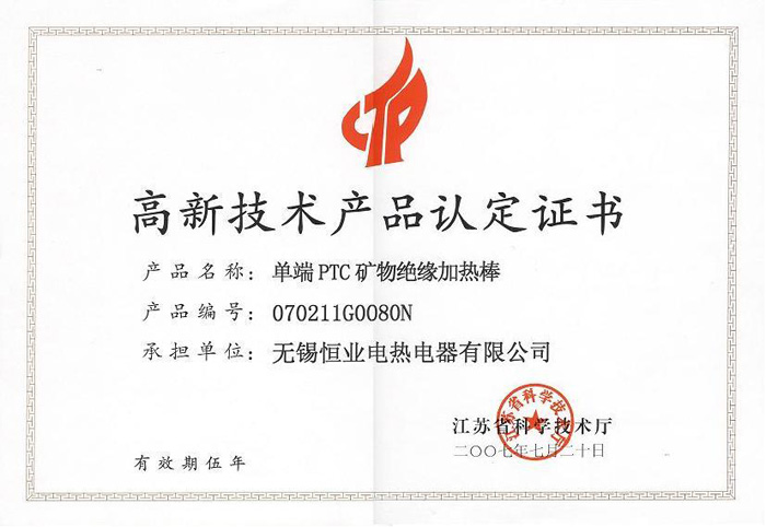 單端PTC礦物絕緣加熱棒高新技術(shù)產(chǎn)品認(rèn)定證書